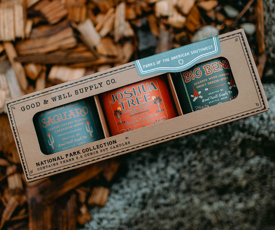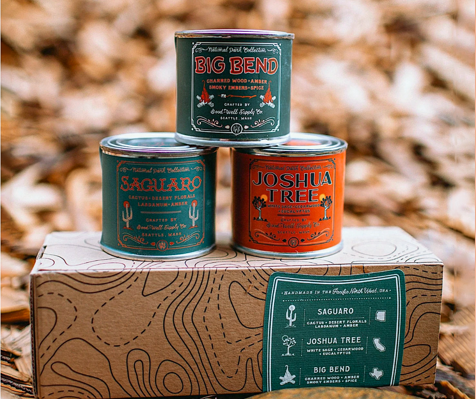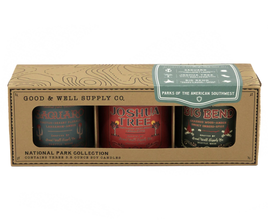 These gift-able sets of three, 4 oz. candles represent some of the most visited regions and National Parks around America. Though they're petite, these candles are mighty; boasting our classic National Parks scents that are sure to fill the room with all the scents of the Great Outdoors. Plus, they look great in our ready-to-gift topographical kraft boxes!