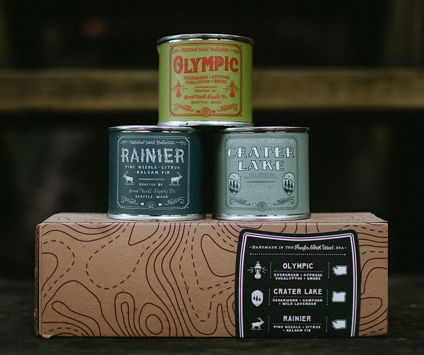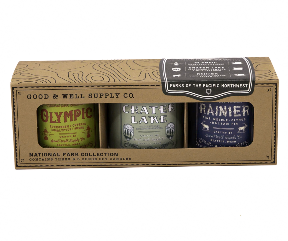 These gift-able sets of three, 4 oz. candles represent some of the most visited regions and National Parks around America. Though they're petite, these candles are mighty; boasting our classic National Parks scents that are sure to fill the room with all the scents of the Great Outdoors. Plus, they look great in our ready-to-gift topographical kraft boxes!